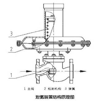 泄氮裝置結(jié)構(gòu)如右圖所示,該裝置采用內(nèi)反饋結(jié)構(gòu),介質(zhì)直接經(jīng)閥蓋進(jìn)入檢測機(jī)構(gòu)(2),介質(zhì)在檢測元件上產(chǎn)生一個(gè)作用力與預(yù)設(shè)彈簧(3)預(yù)緊力相平衡。當(dāng)罐內(nèi)壓力升高到高于泄氮裝置壓力設(shè)定點(diǎn)時(shí),平衡被破壞,使閥芯(1)上移,打開閥門,向外界泄放氮?dú)?;?dāng)罐內(nèi)壓力降到泄氮裝置壓力設(shè)定點(diǎn)時(shí),由于預(yù)設(shè)彈簧力作用,關(guān)閉閥門。