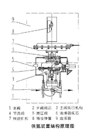供氮裝置結(jié)構(gòu)如右圖所示,將設(shè)在罐頂?shù)娜狐c(diǎn)的介質(zhì)經(jīng)導(dǎo)壓管引入檢測機(jī)構(gòu)(7)、介質(zhì)在檢測元件上產(chǎn)生一個(gè)作用力與彈簧(8)、預(yù)緊力相平衡。當(dāng)罐內(nèi)壓力降低到低于供氮裝置壓力設(shè)定點(diǎn)時(shí),平衡被破壞,使指揮器閥芯(6)打開,從而使閥前氣體經(jīng)減壓閥(5)、節(jié)流閥(4)、進(jìn)入主閥執(zhí)行機(jī)構(gòu)(3)上、下膜室,打主開閥閥芯(2)、向罐內(nèi)充注氮?dú)?;?dāng)罐內(nèi)壓力升到供氮裝置壓力設(shè)定點(diǎn)時(shí),由于預(yù)設(shè)彈簧力,關(guān)閉指揮器閥芯(6)又由于主閥執(zhí)行機(jī)構(gòu)中彈簧作用,關(guān)閉主閥,停止供氮。