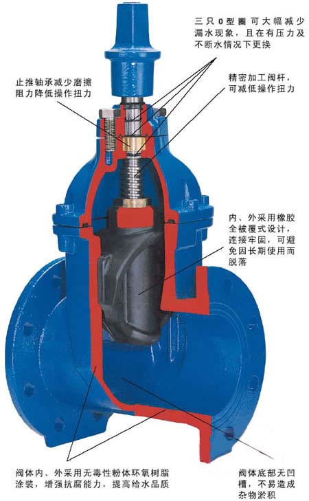 彈性座封閘閥也稱軟密封閘閥,彈性座封閘閥采用無(wú)凹腔結(jié)構(gòu),閥體閥蓋內(nèi)外表面噴涂環(huán)氧樹(shù)脂,閘板表面包覆橡膠,這樣從根本上杜絕了腐蝕發(fā)生的可能性,閥桿密封處舍棄填料而采用“O”形密封圈,使得蜜蜂更加可靠。根據(jù)需要,本閘閥可以采用操作桿、手輪、電動(dòng)及氣動(dòng)等方式操作。